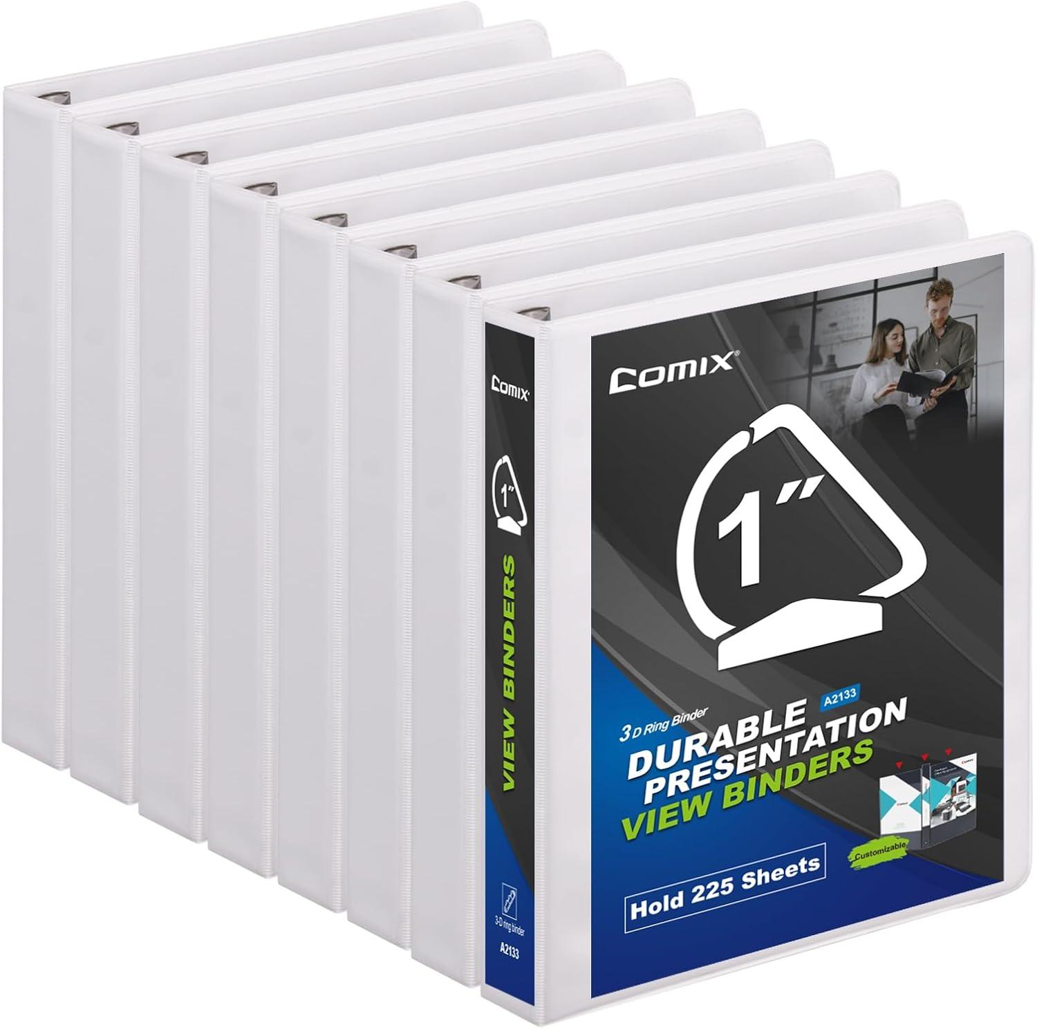 Comix Sturdy 3-Ring-Binder 1-inch D Ring Binders Hold 225 Sheets of 8.5″ x 11″ Paper, 8 Pack (White)(White)