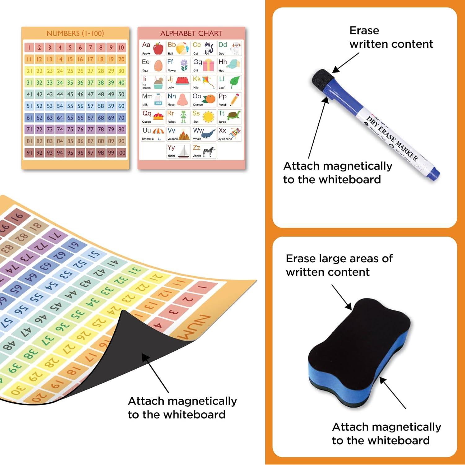 【Educational Chart Set】This white board small set comes with magnetic number charts and alphabet charts, whiteboard marker, and eraser. Kids can attach charts to one side and freely write on the other — perfect for fun and interactive learning.