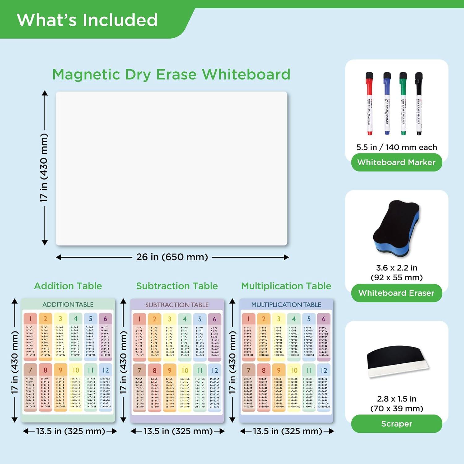 • COMIX Whiteboard Dry Erase, 26″ x 17″ Adhesive Whiteboard for Wall with Magnetic Alphabet Chart, 1-100 Number Chart, Educational Charts Set for Preschool Student Kids Home Classroom Teaching(Addition Subtraction Multiplication Table)